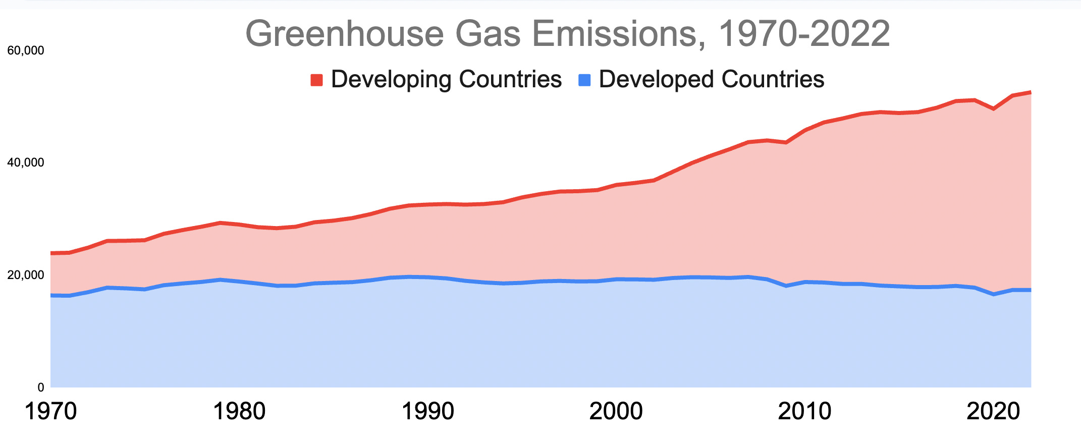 At ruinous political and economic costs, the climate movement bought itself a slow, gradual reduction in greenhouse gas emissions from the developed countries. Because annual rich country emissions did fall, a bit, from a high 19.7 billion tons of CO2 equivalent in 2007 to 17.4 billion in 2022.