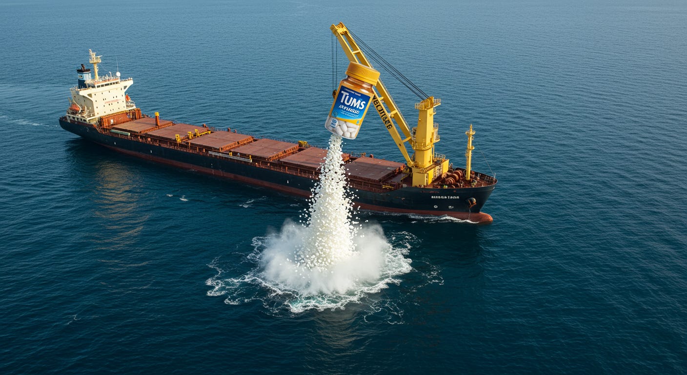 The idea of sprinkling TUMS into the ocean has a certain homespun appeal. The science is refreshingly simple — you don’t need to know anything beyond 10th grade chemistry to understand that a base neutralizes an acid, and a less acidic ocean is good both for ocean ecosystems and for carbon removal.